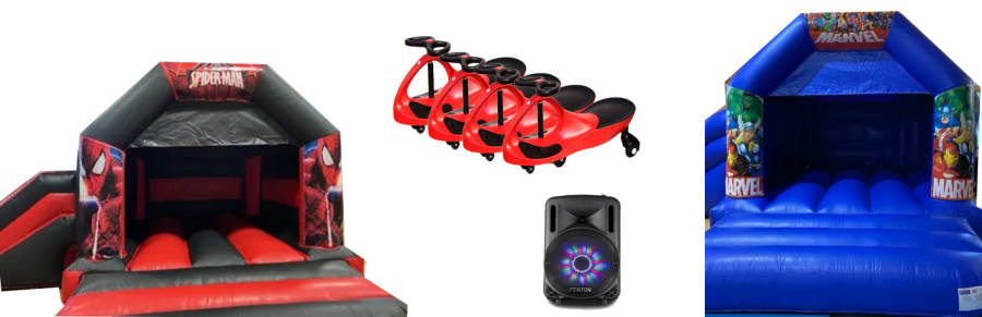 2 bouncy castle/slide combos (bouncy castles with small slides on side) these are super hero themed marvel and spider man