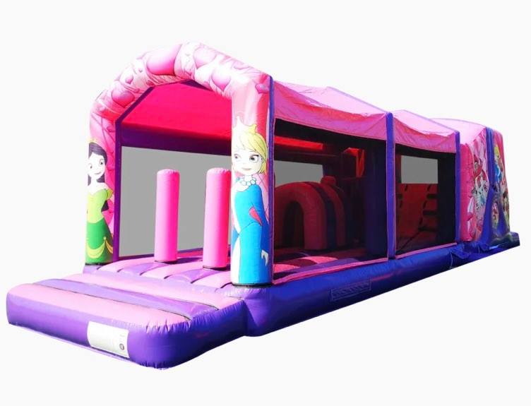 Here is our princess themed pink and purple 45ft long 2 part obstacle course.