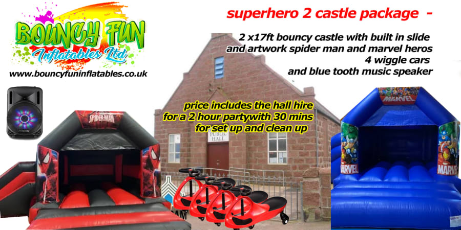 2 bouncy castle/slide combos (bouncy castles with small slides on side) these are super hero themed marvel and spider man
