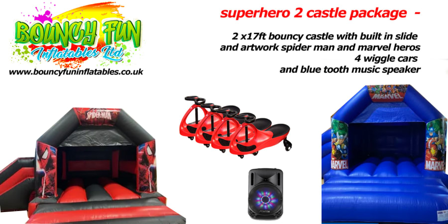 2 bouncy castle/slide combos (bouncy castles with small slides on side) these are super hero themed marvel and spider man