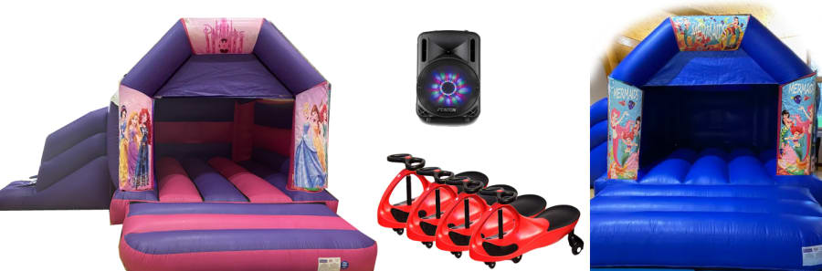 2 bouncy castle/slide combos (bouncy castles with small slides on side) these are princess pink and mermaid themed